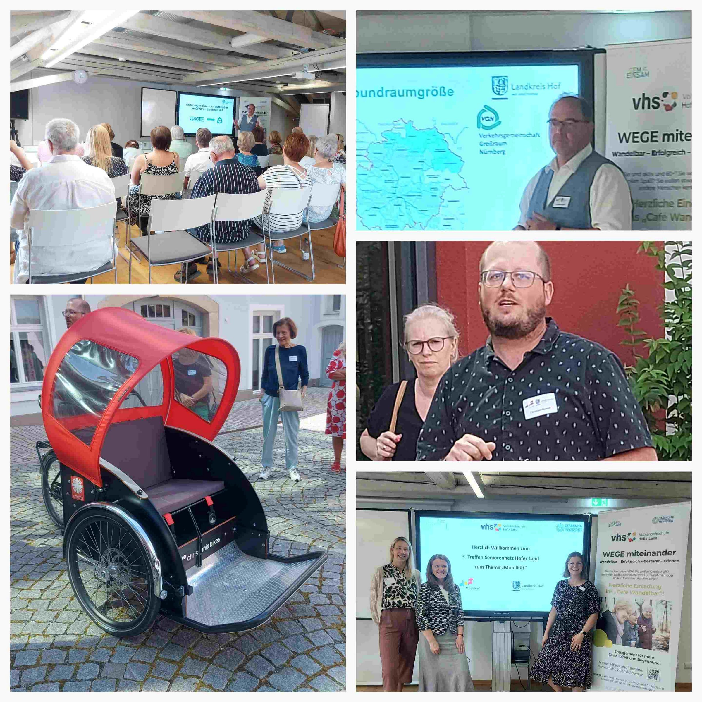 Als erster Referent stellte Christian Nowak (Geschäftsführer Caritas Stadt und Landkreis Hof) das Projekt „Radeln ohne Alter – Senioren-Rikscha“ vor. Dieser Vortrag mit hohem Praxisanteil wurde von der 3. Etage der VHS ins Außengelände verlegt. Im Innenhof präsentierte Herr Nowak eine Rikscha und konnte vor Ort Fragen beantworten. Wer das Projekt unterstützen, die Rikscha nutzen oder Pilot werden möchte, findet hier weitere Informationen https://caritas-hof.de/einrichtungen/rikscha--standort