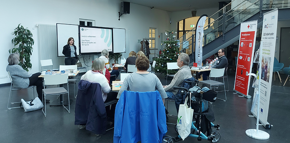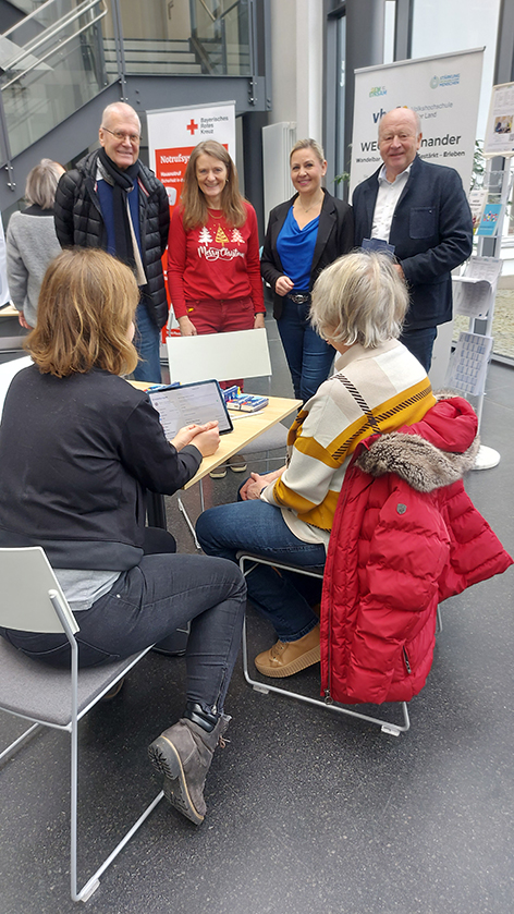 Theresa Kuper beantwortete als „Digitaler Engel“ individuelle Fragen in der offenen Sprechstunde. Das Bayerische Rote Kreuz (BRK) informierte zeitgleich über mobile Notrufsysteme und die Kriminalpolizei zeigte das korrekte Verhalten bei Schockanrufen. Diese und andere wichtigen Themen sollen Sicherheit schaffen bei der Nutzung von Smartphone und Tablet, denn gerade bei der Stärkung der Teilhabe älterer Menschen sind Unterstützung beim Umgang mit und Übung an digitalen Geräten essentiell. Am Nachmittag ging es beim „Digitalen Engel“ um die Sicherheit beim Weihnachtseinkauf via Online-Shop. Eine Auswahl vielfältiger regionaler Online-Shops diente hier als Beispiel.